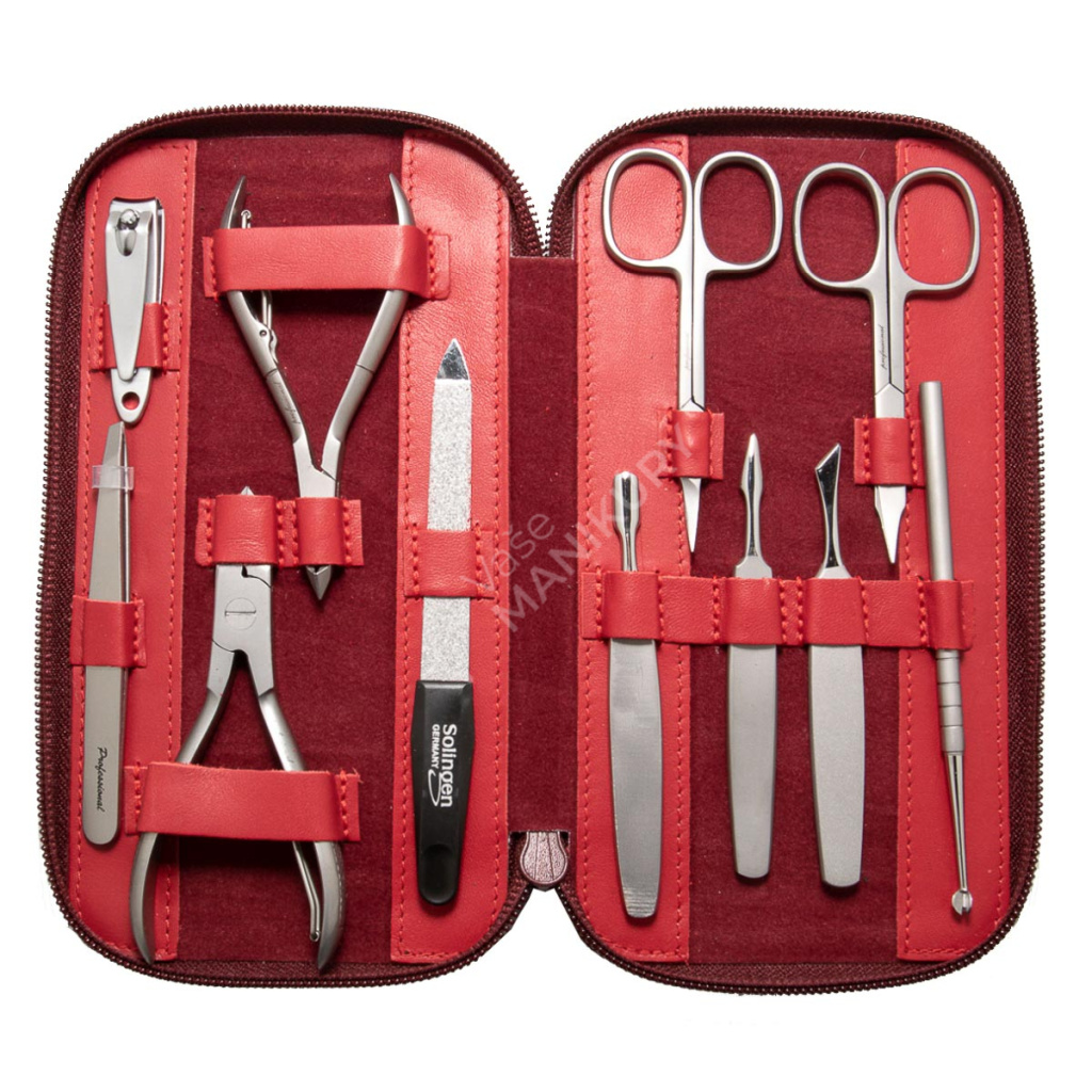 Dámská manikúra a pedikúra v praktickém červeném koženém pouzdru je vybavena prvotřídními nástroji značky Solingen.