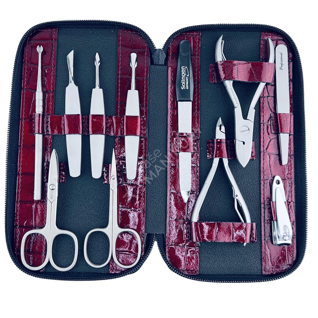 Tyto prvotřídní nástroje jsou uloženy v sytě červeném pouzdru. Pouzdro je je vyrobeno z pravé kůže a upraveno do vzhledu lesklé krokodýlí kůže.Pouzdro se uzavírá na zip. Nádherná sada bude vaším skvělým pomocníkem při péči o vaše nehty a pomůže vám udržovat dokonalý vzhled vašich rukou.