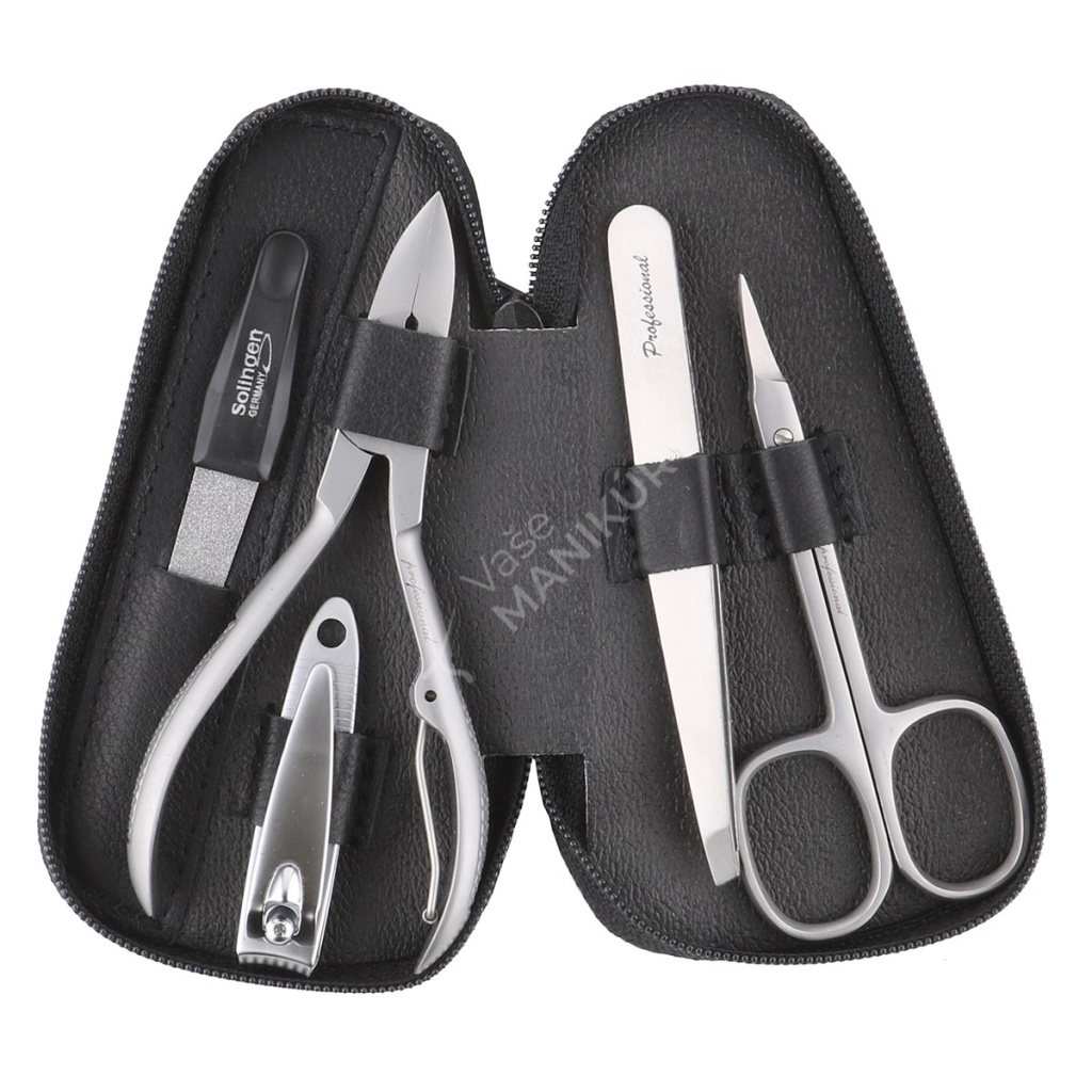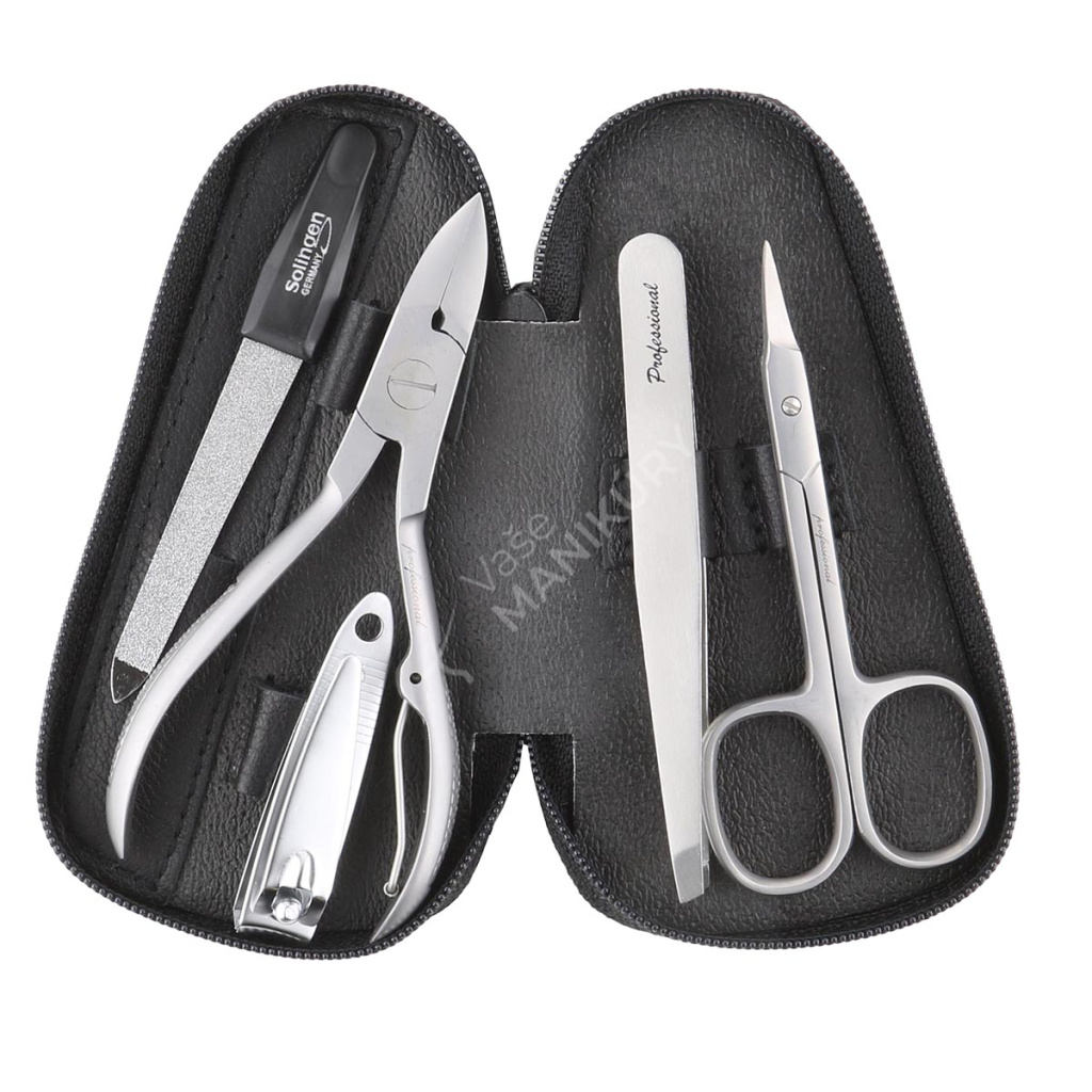 Pouzdro je vyrobeno z přírodní hovězí kůže v černé barvě a uzavírá se na zip. Uvnitř najdete 4 nástroje z nerezové oceli z řady Professional a safírový pilník Solingen.
