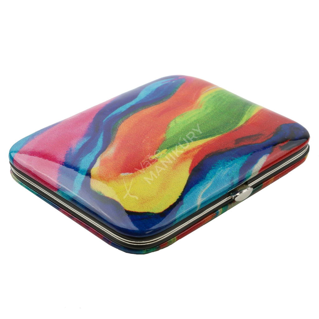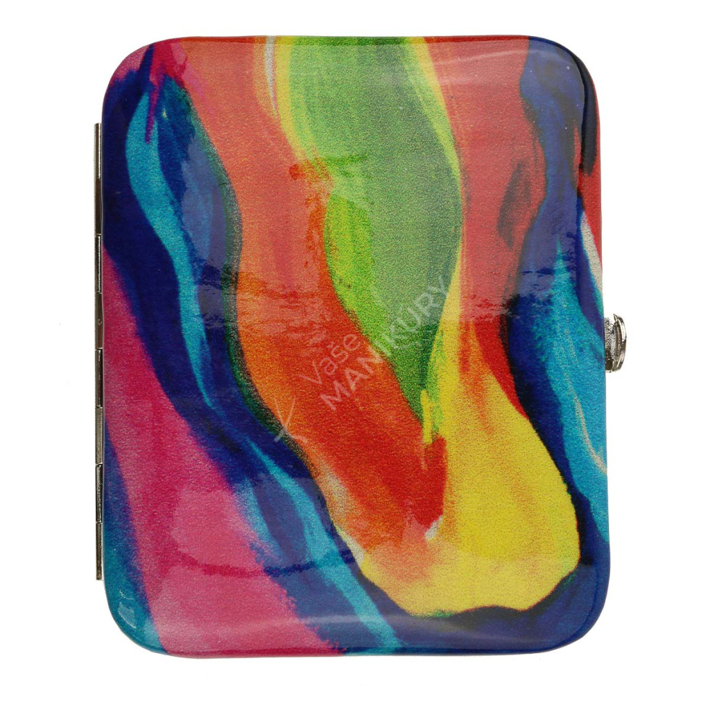 Krásné pouzdro s kovovým rámem je vyrobeno z pravé kůže s abstraktním barevným motivem s hladkou povrchovou úpravou. Dvoudílný ocelový pochromovaný rám umožňuje pohodlné a spolehlivé otevírání manikúry.