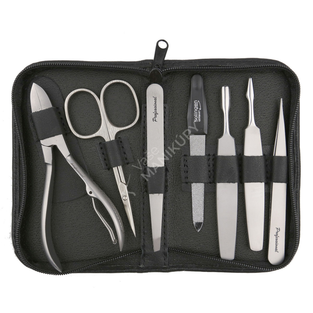 Pouzdro je vyrobeno z kvalitní hovězí kůže v černé barvě a je uzavíratelné na zip. Uvnitř najdete nůžky a pilník Solingen. Ostatní nástroje jsou z nerezové oceli v matové úpravě řady Professional. Výrobky Solingen i nerezové nástroje jsou proslulé dlouhou životností.