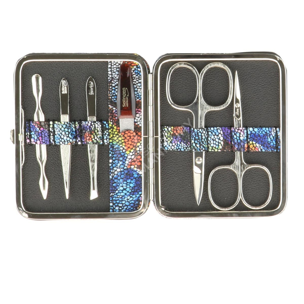 Pěkná 6dílná manikúra pro ženy s kvalitními nástroji Solingen v koženém pouzdru s kovovým rámem.