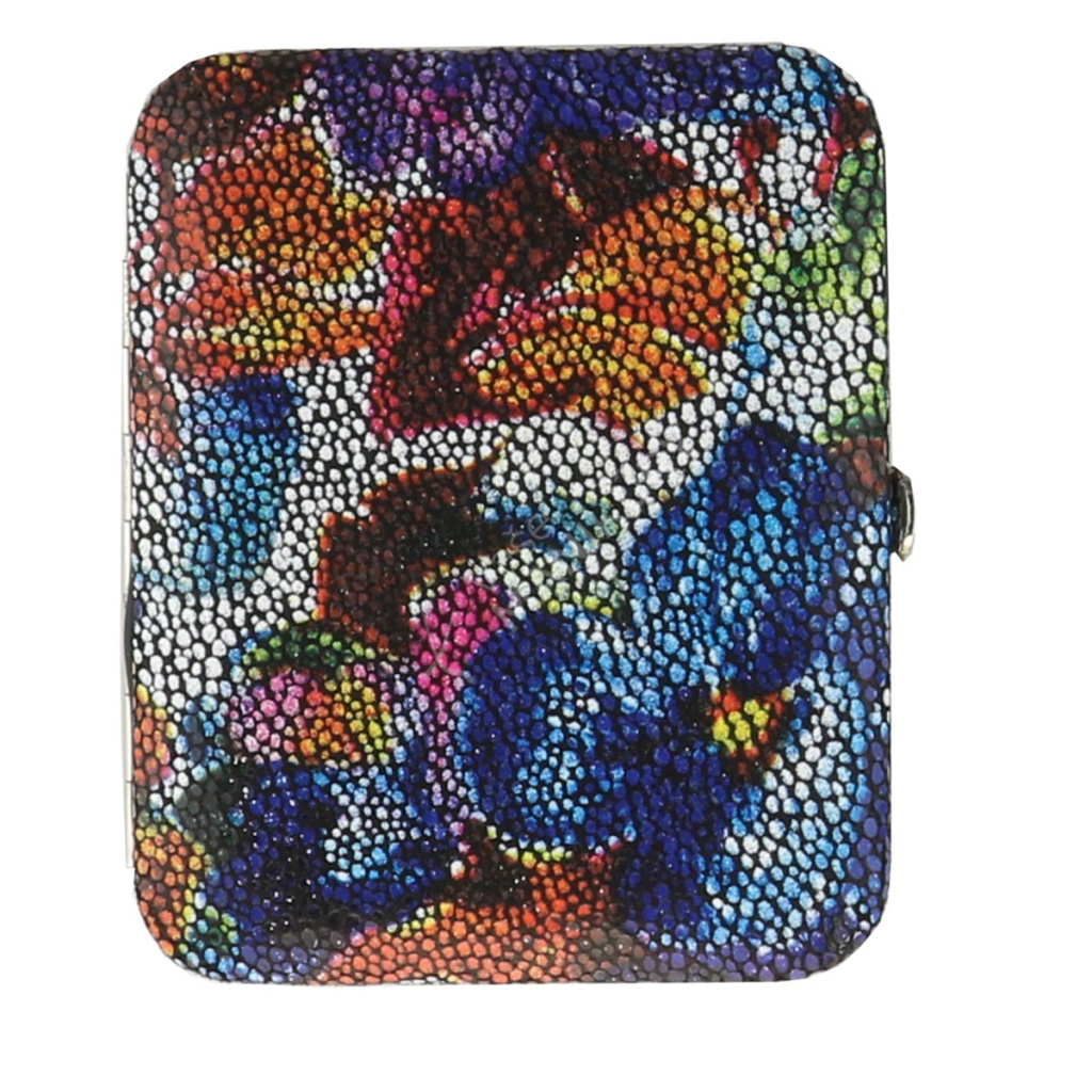 Pěkné barevné pouzdro s abstraktním motivem květů s kovovým rámem je vyrobeno z pravé kůže .Dvoudílný ocelový pochromovaný rám umožňuje pohodlné a spolehlivé otevírání manikúry.