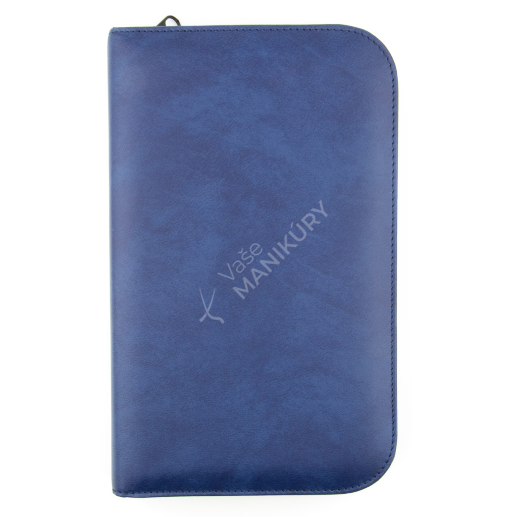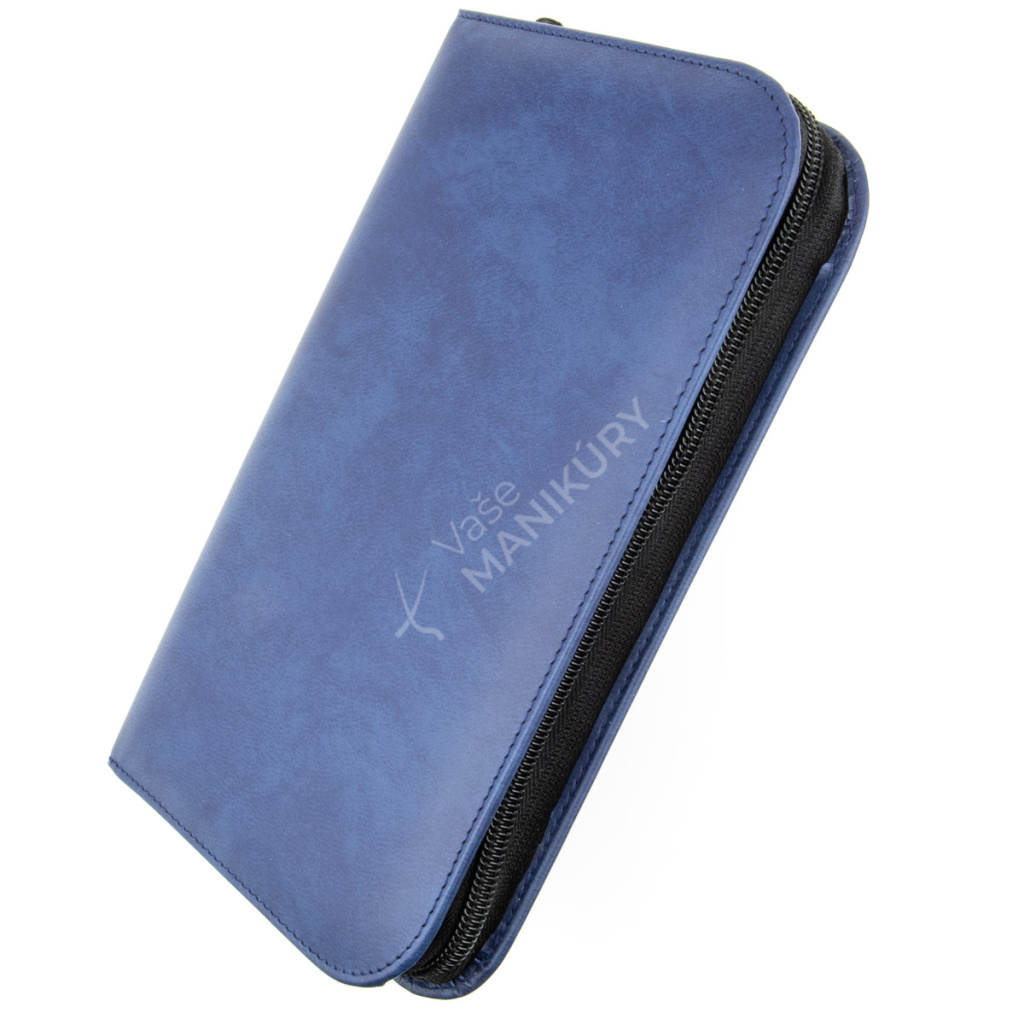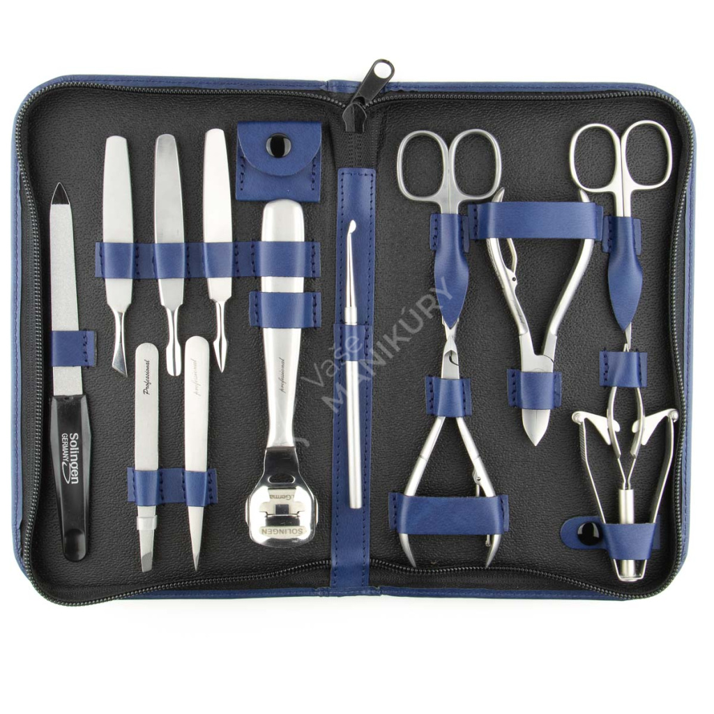 Modrá kožená velmi účelně vybavená manikúra a pedikúra Solingen. Kvalitní nástroje jsou vyrobeny z prvotřídní nerezové oceli.