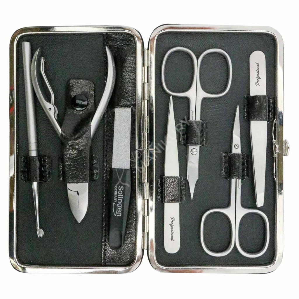 Nádherná luxusně vypadající sada na manikúru v černém koženém pouzdru a kvalitními nástroji Solingen.