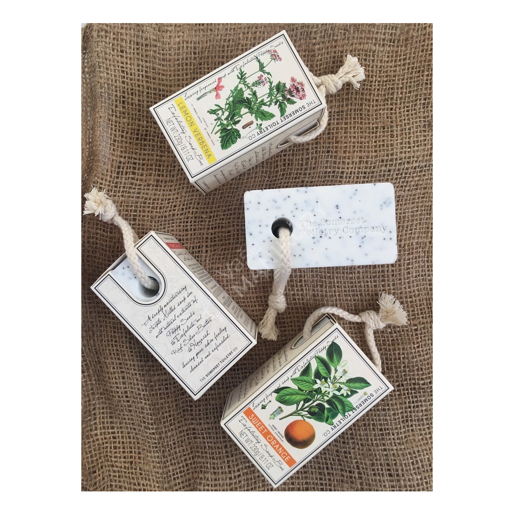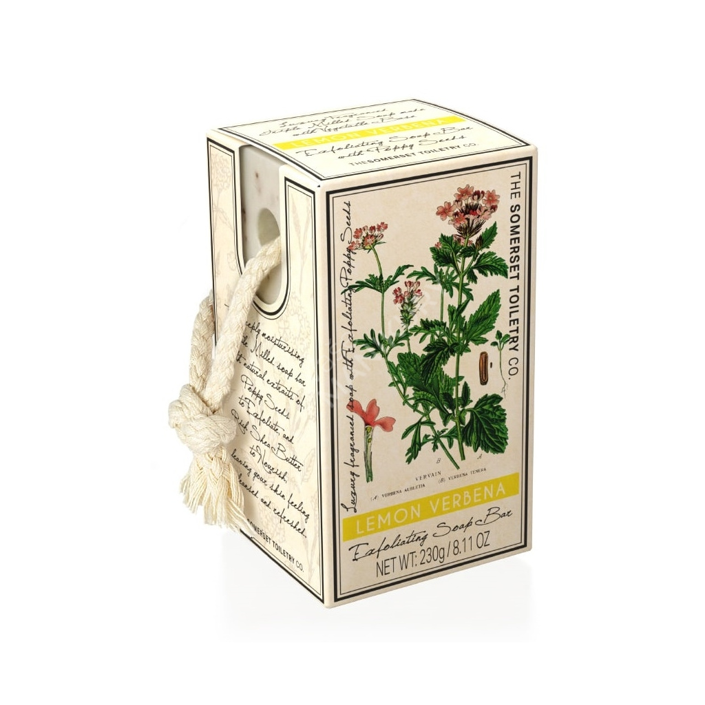 Luxusní peelingové mýdlo na provázku se svěží vůní verbeny a citrónu.
