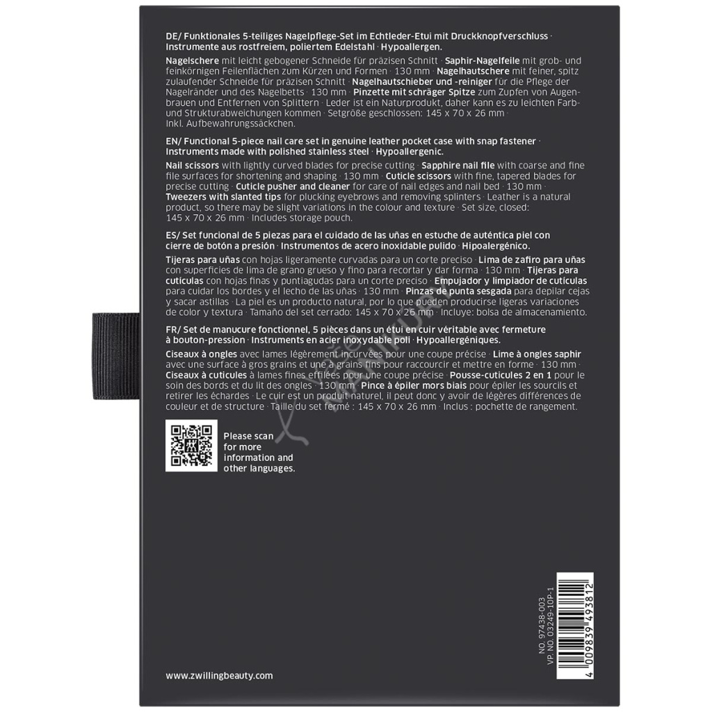 5dílná manikúrní sada Zwilling s nástroji ze série Classic Inox spojuje špičkovou kvalitu, elegantní design a praktičnost. Stylová sada obsahuje pět nejčastěji používaných nástrojů pro péči o nehty a kůžičku, a je ideální pro každodenní použití. Kompaktní provedení pouzdra umožňuje bezpečné uložení manikúrních nástrojů doma i na cestách.
