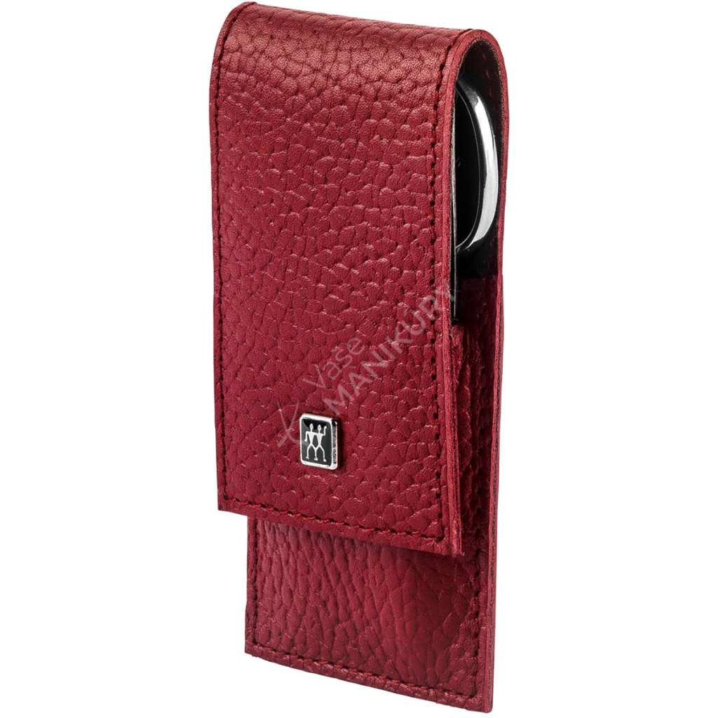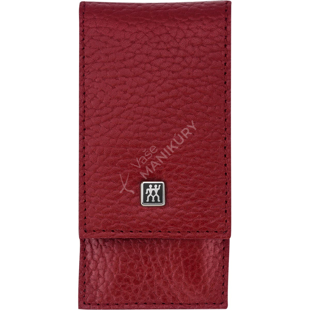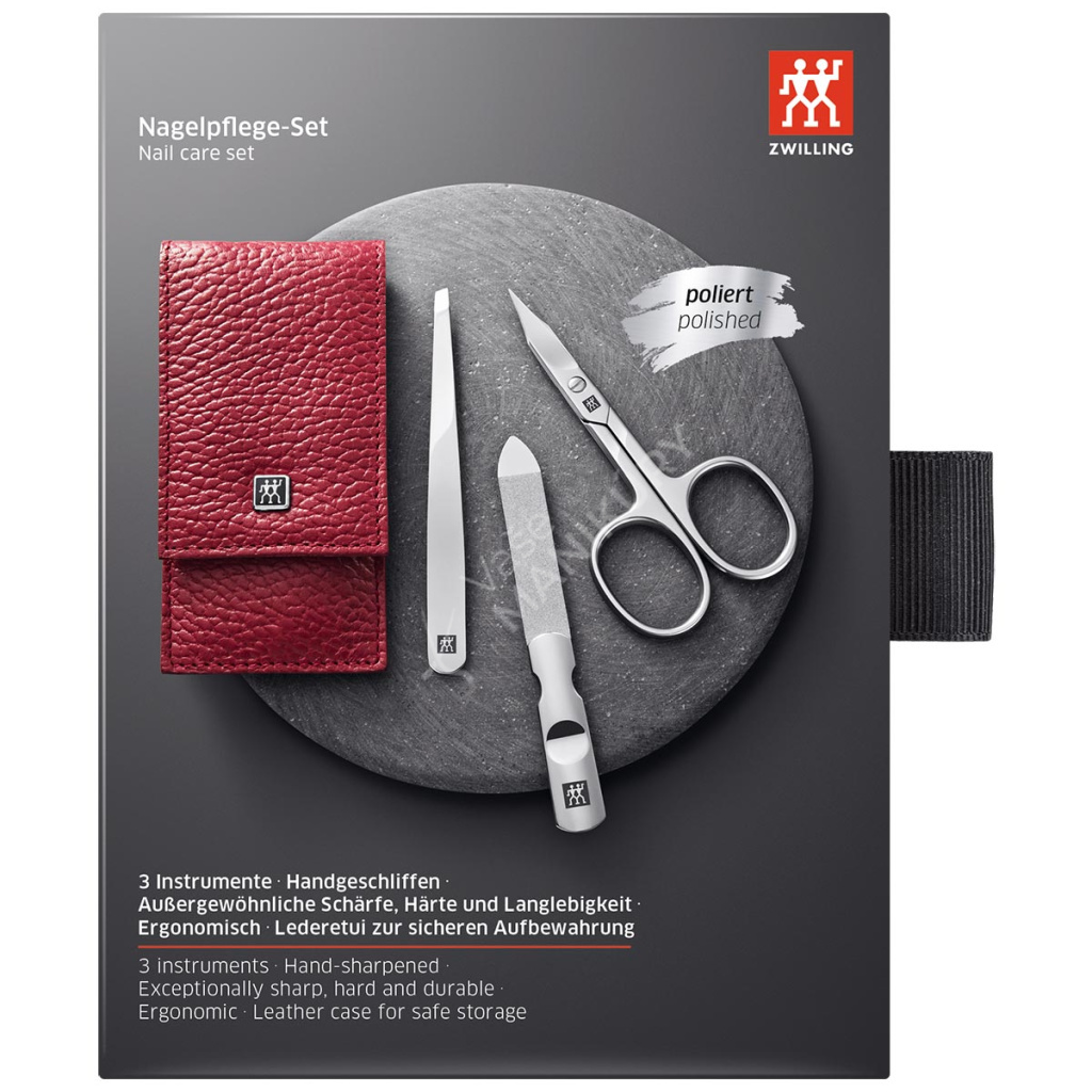 Praktická 3dílná sada ZWILLING s nástroji z poniklované leštěné nerezové oceli v atraktivním červeném koženém pouzdře.