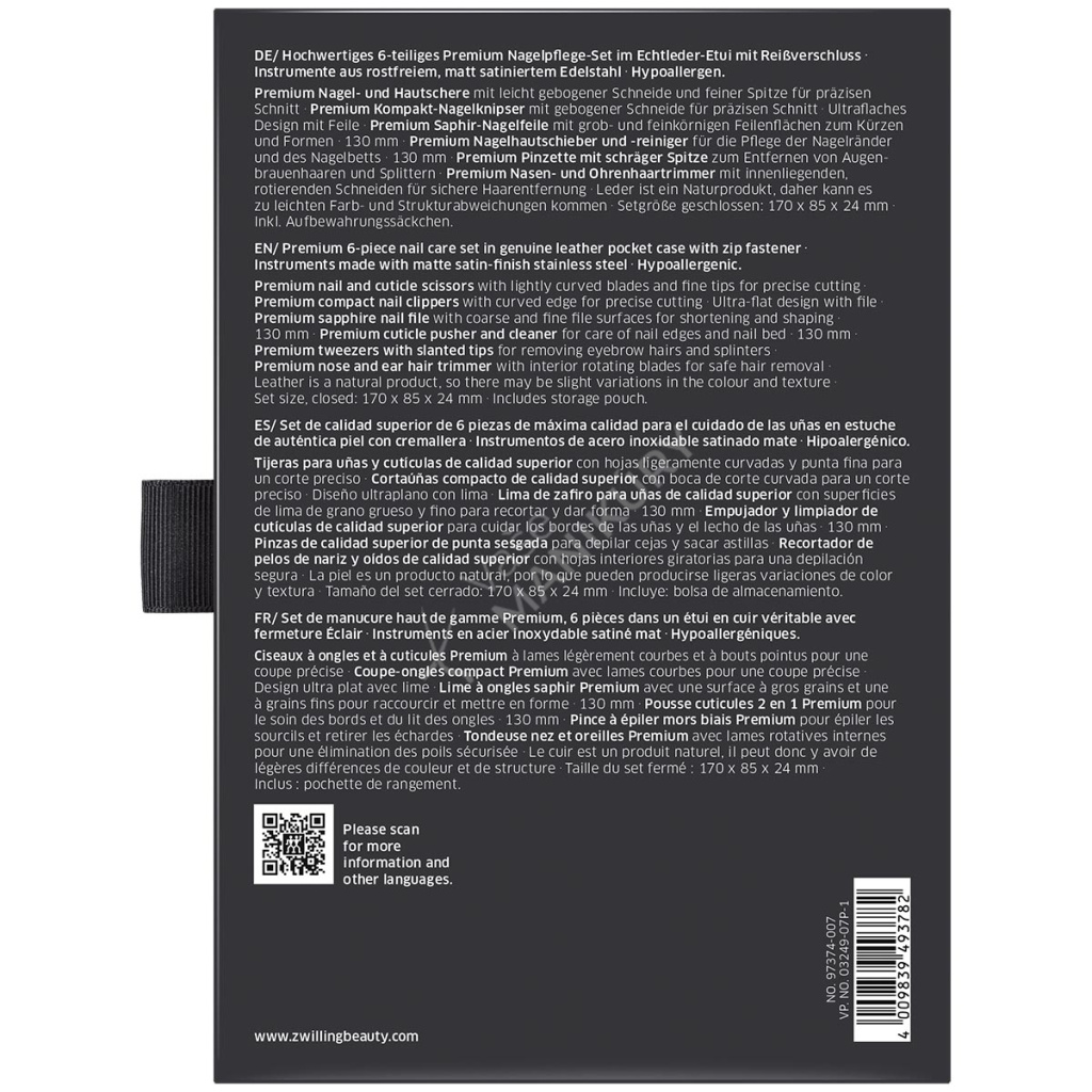 Luxusní pánská 6dílná sada na manikúru a pedikúru prémiové kvality z kolekce PREMIUM TWINOX® od německé značky ZWILLING Beauty obsahuje nejdůležitější nástroje pro kompletní péči o nehty. Součástí sady je také nástroj pro přesné a bezpečné odstraňování chloupků z nosu a uší. Tato manikúrní sada v elegantní černé barvě je skvělou volbou pro každého, kdo oceňuje pohodlí, styl a špičkovou kvalitu v péči o nehty.